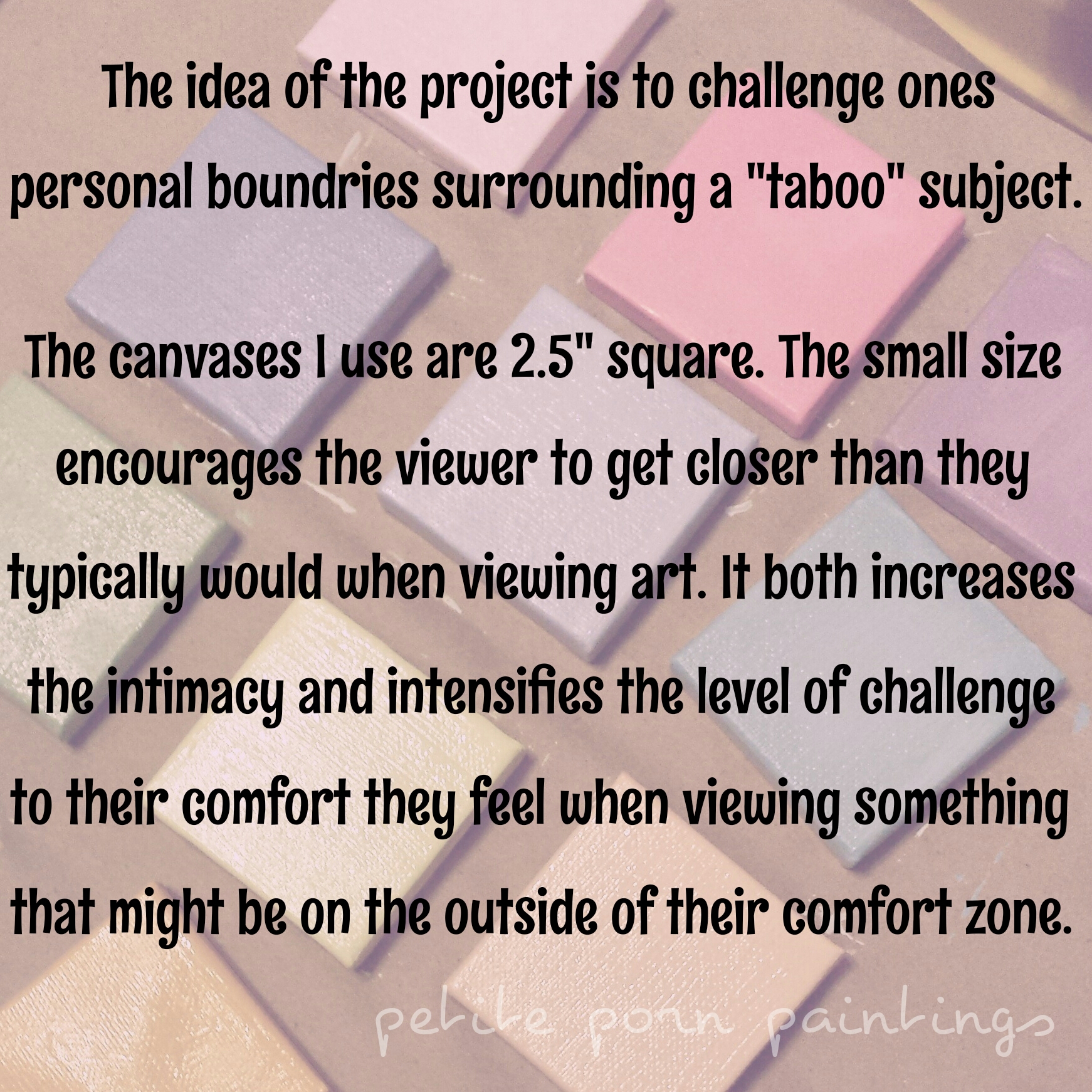 About Painting smut, 6.25 square inches at a time, that encourages the viewer to confront their own limits and push their personal boundaries. Share this: Click to share on X (Opens in new window) X Click to share on Facebook (Opens in new window) Facebook Like Loading...
